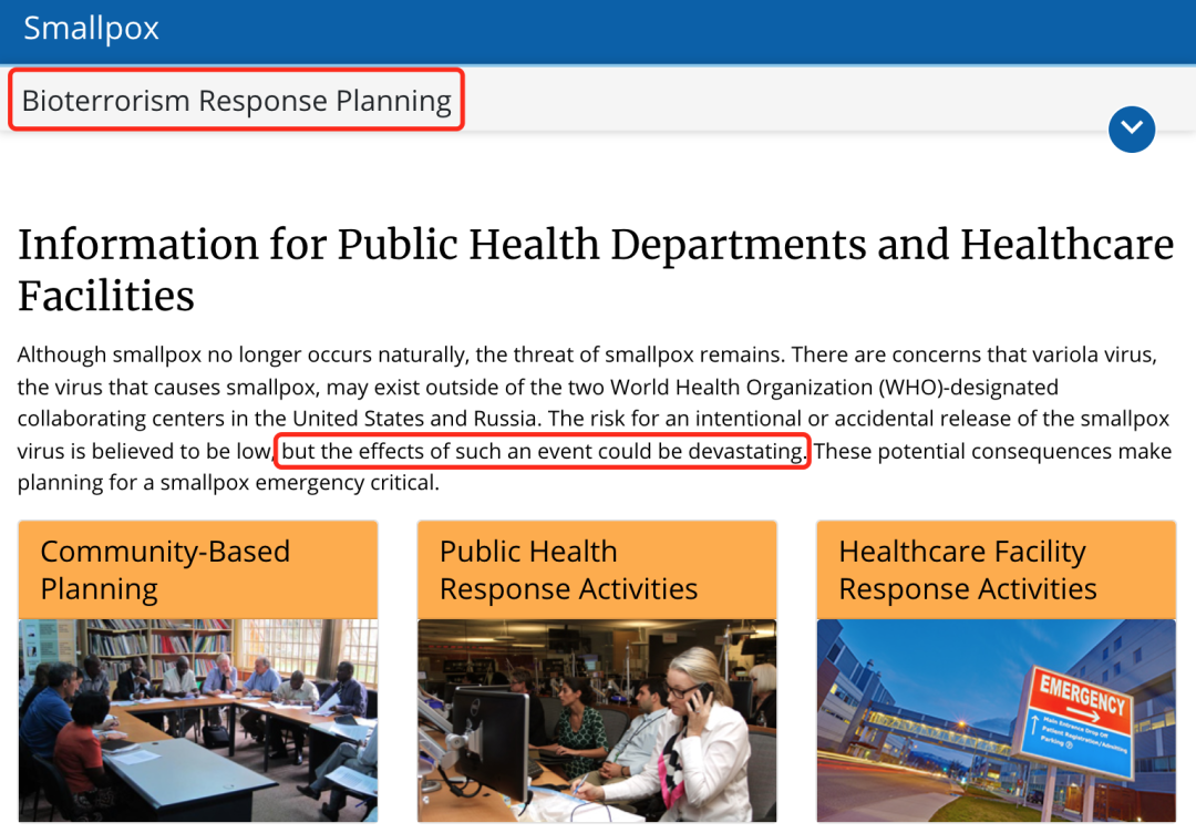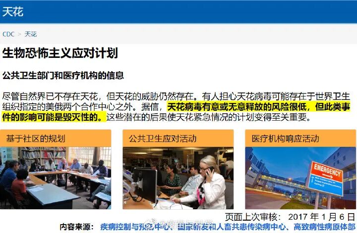 值得注意的是,在美国疾控中心的网站上,他们早有关于关于天花病毒万一从美国和俄罗斯的两个实验室里泄露的具体措施。